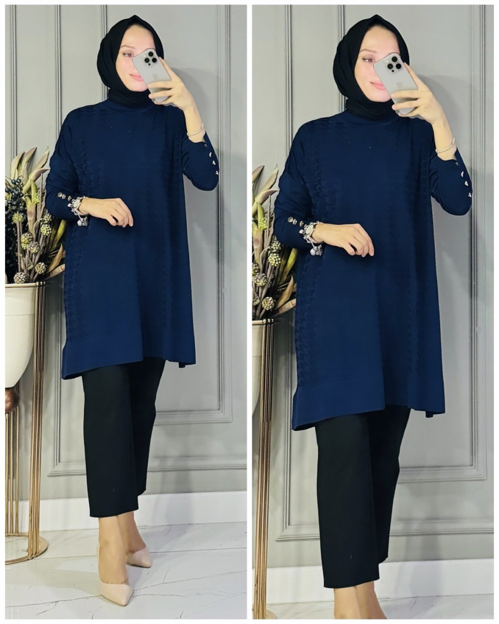 Buket kazayağı desen triko tunik Lacivert