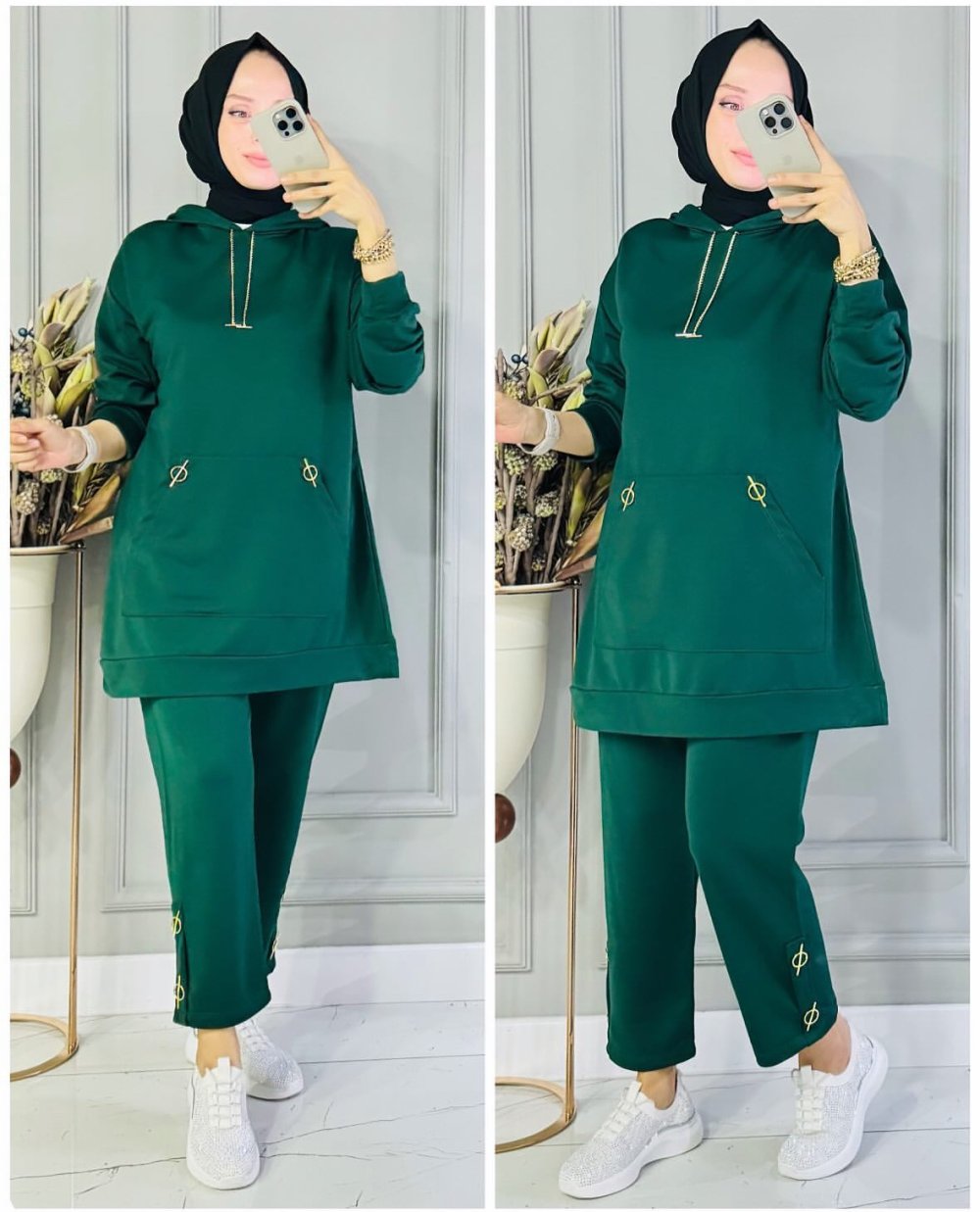 Gold zincirli iki iplik takım Zümrüt