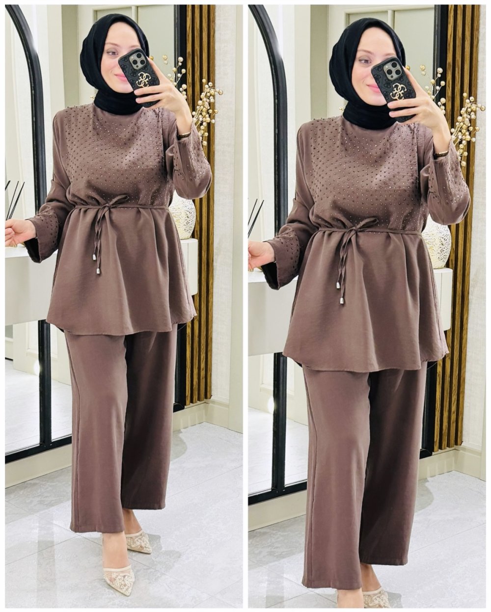 Nurbanu taşlı takım Kahverengi