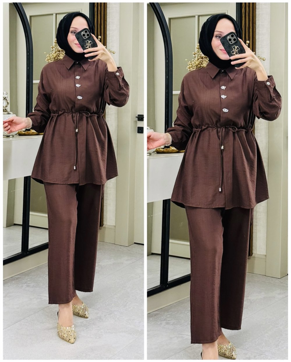 Sena önü taşlı takım Kahverengi